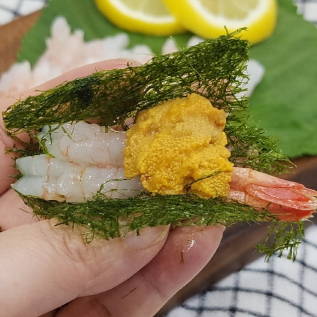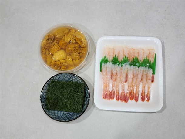 ※ 중량/ 사이즈 : 성게알 1통 100g, 단새우회 1팩 (20미 / 60g 내외), 감태 1봉 4g