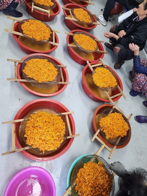 A. 베테랑 분들이 성게알을 작업하고 있어요!